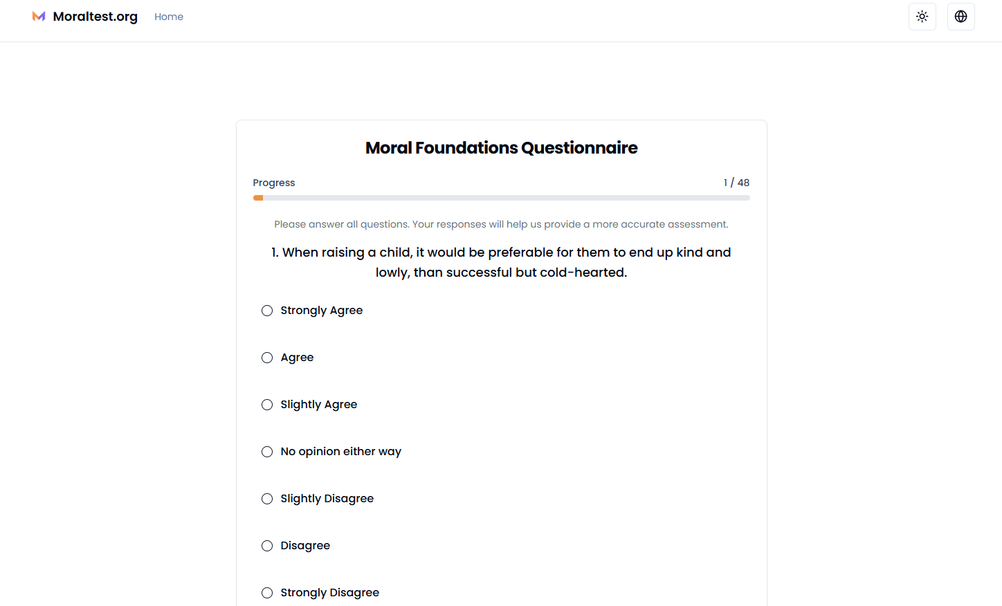 MoralTest.org provides a scientific Moral test for personalized ethical understanding. Foster self-awareness and guide your moral growth, applicable to education and AI. Start your journey!
